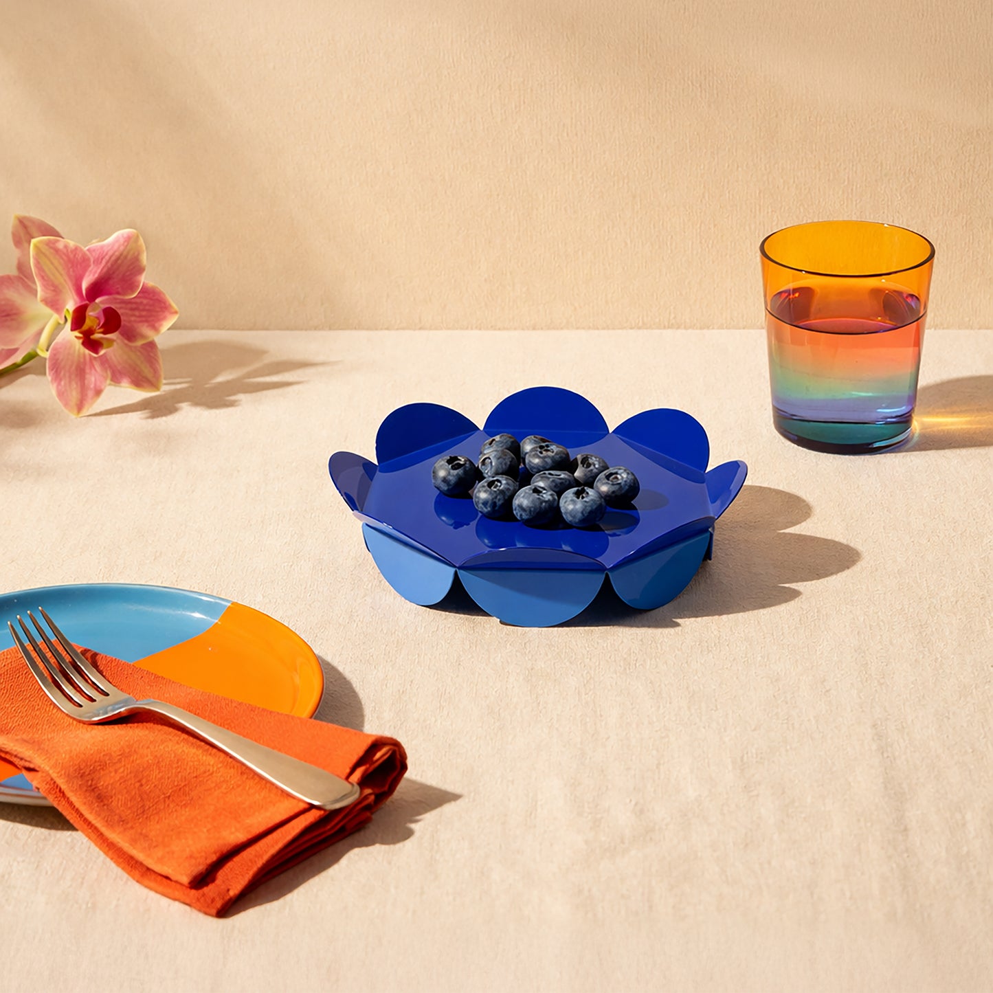 Bu küçük servis standı, ISUWA'nın imzası olan çiçek silüetini cesur mavi bir kaplamayla sunuyor. Meyveler, tatlılar veya yaratıcı sunumlar için mükemmel olan bu ürün, günlük rutinlerinizi görsel bir şölene dönüştürüyor.
